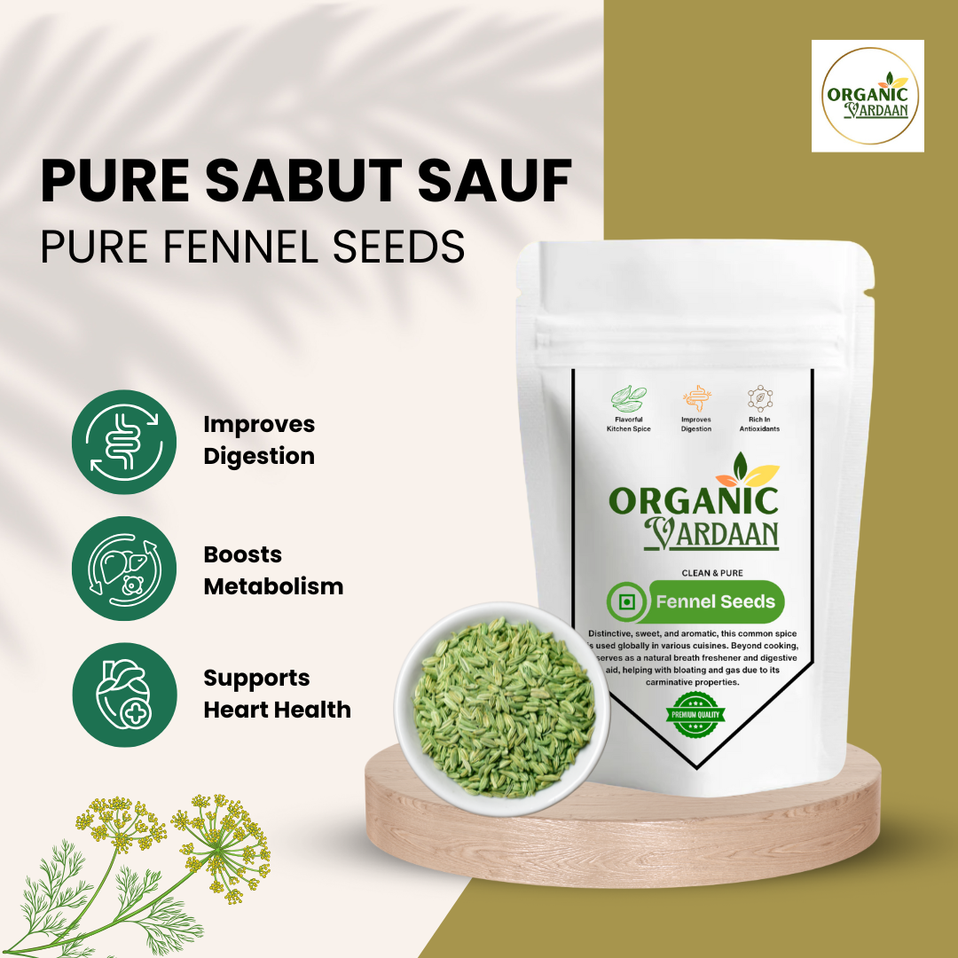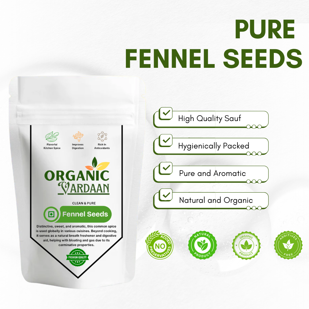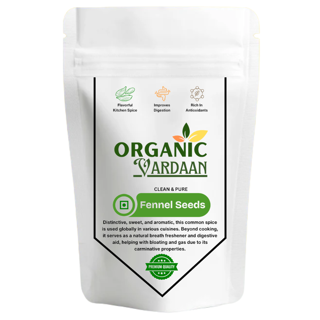 Description: Introducing Vardaan Organic Fennel Seeds, your daily dose of nature's goodness. Also known as "Saunf" in Hindi, these small, pale green seeds are a cherished spice in Indian kitchens and a powerful ally for your health. Organically cultivated and unadulterated, our fennel seeds are packed with a sweet, aromatic flavor and a host of benefits that have been treasured for centuries.