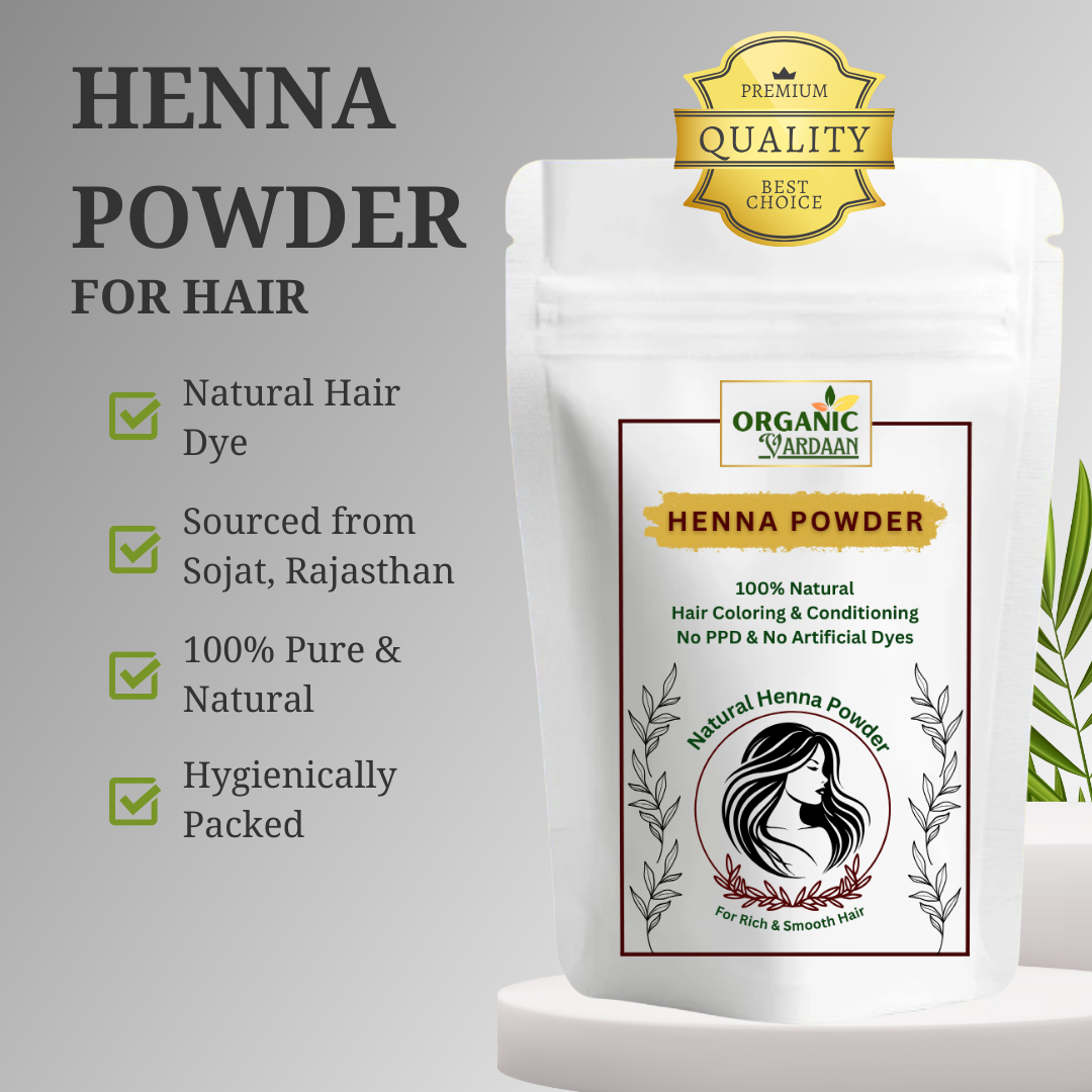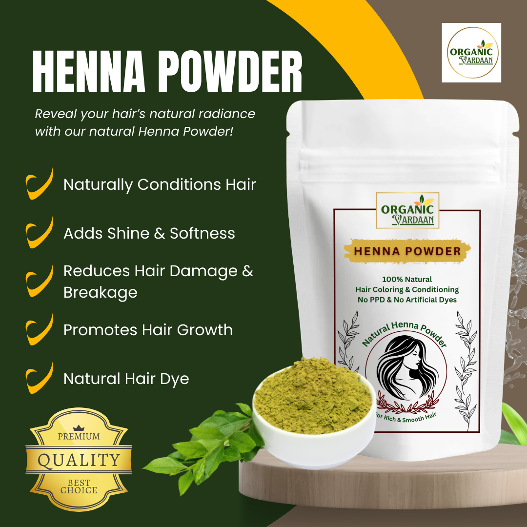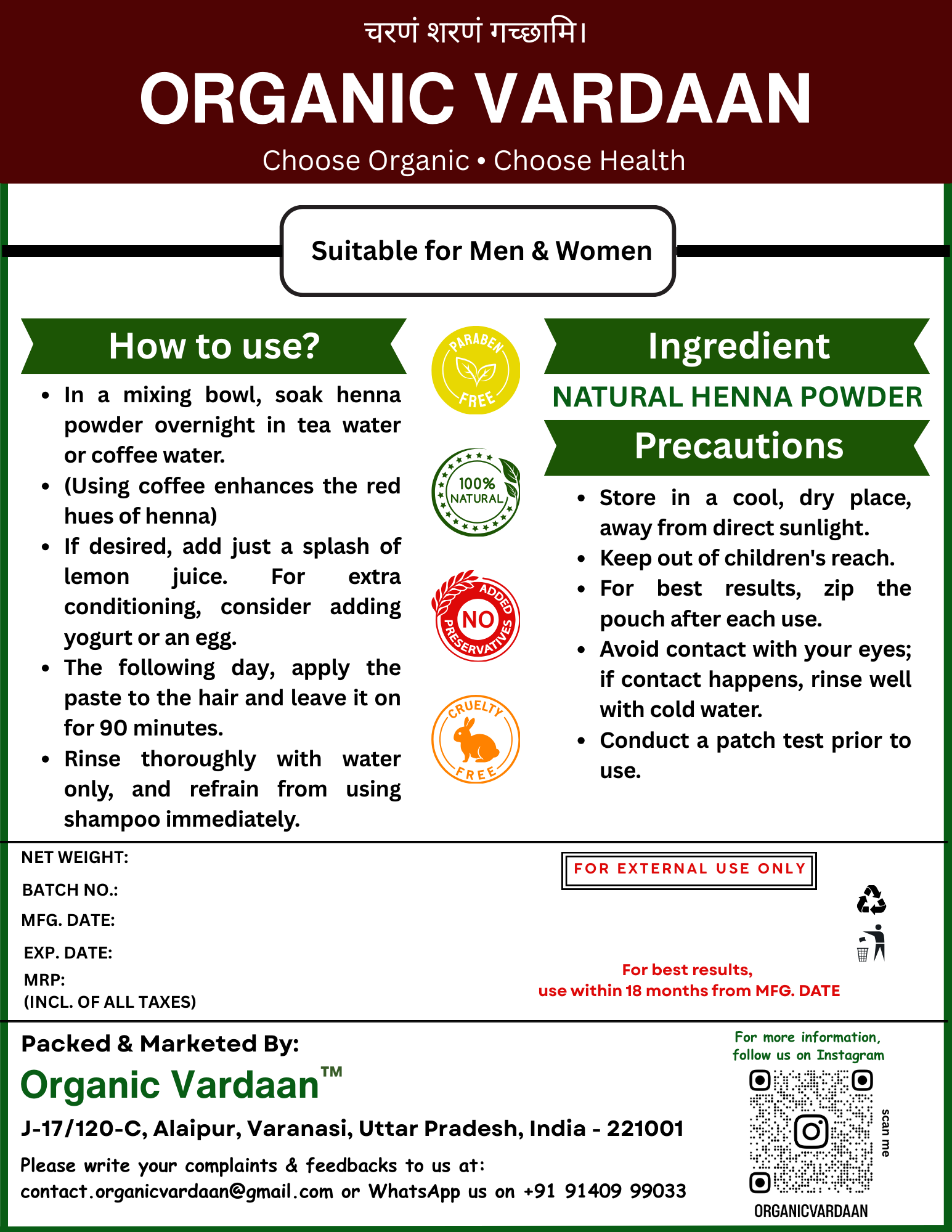 Description: Organic Vardaan Henna Powder is a pure, natural hair coloring and conditioning treatment crafted from the finely ground leaves of the henna plant (Lawsonia inermis). For centuries, henna has been a cherished part of traditional hair care, known for its ability to impart a rich reddish-brown hue while nourishing and strengthening hair from root to tip. Our henna powder is organically grown and processed without any chemicals, metallic salts, or synthetic dyes, ensuring a safe and authentic hair care experience.